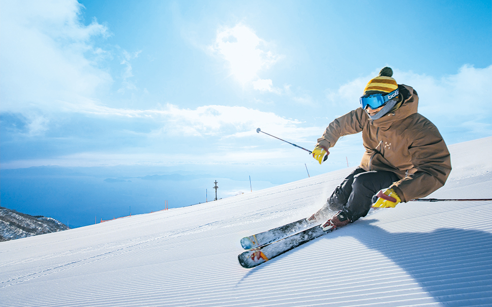 一方、いちばん人気のコースといえば、琵琶湖を南北にパノラマで見渡せる「ホーライパノラマゲレンデ」。幅広な1枚バーンで、琵琶湖に飛び込むかのような滑走感は最高のひと言!