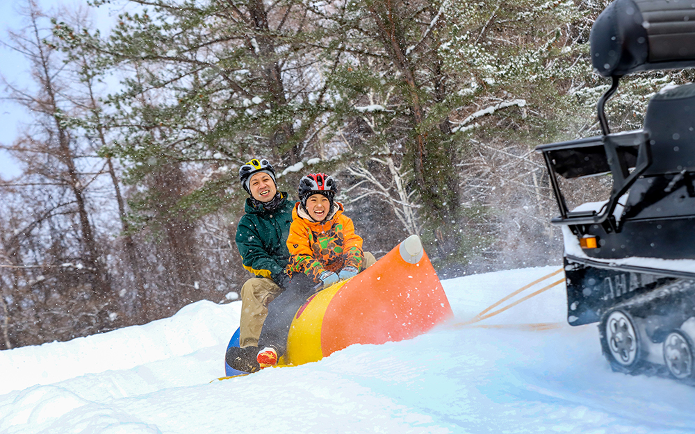 富良野ZONEのベース、新富良野プリンスホテルに隣接したウィンターアクティビティエリア「FURANOスノーランド」では、スノーモービルやスノーラフティング、スノーバナナボートなどを、ファミリーみんなで楽しむことができます。