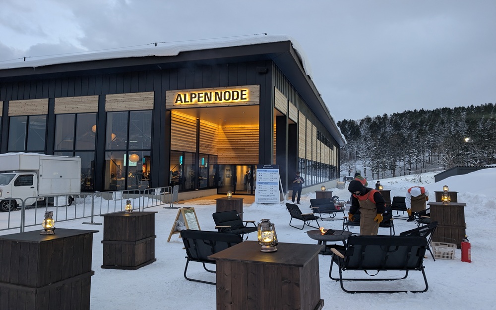 もうひとつのNEW店舗がエースゴンドラ山麓駅近くに建てられた「ALPEN NODE」内の「POWDERHOOD RESTAURANT & TAPROOM」です。