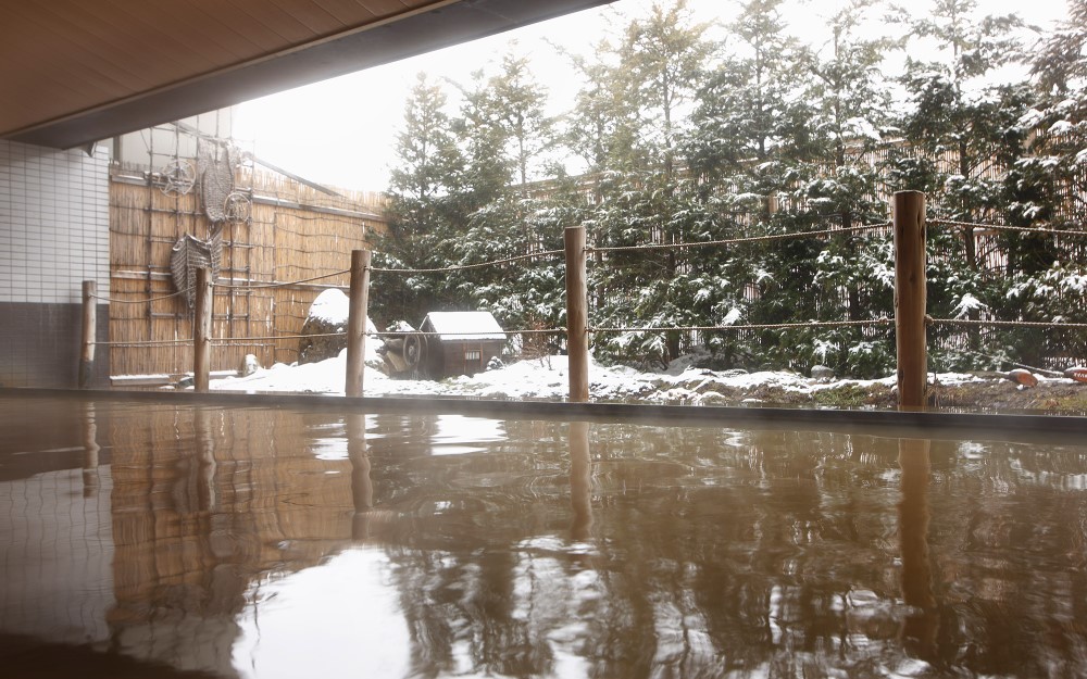 「苗場プリンスホテル」の温泉は中性低張性の「火打の湯」。泉質はナトリウム・カルシウム-塩化物泉で、筋肉痛や冷え性に効果があるそう。露天もあるから、ゆっくり癒しの時間を過ごしましょう。