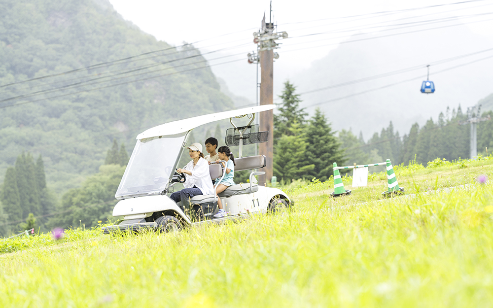 「苗場プリンスホテル」の広大なゲレンデをお手軽に散策するなら「お散歩カート」がおすすめ。4人乗りカートに家族みんなで乗り込んで、大自然を感じつつ、爽快な高原の風を感じてみませんか?