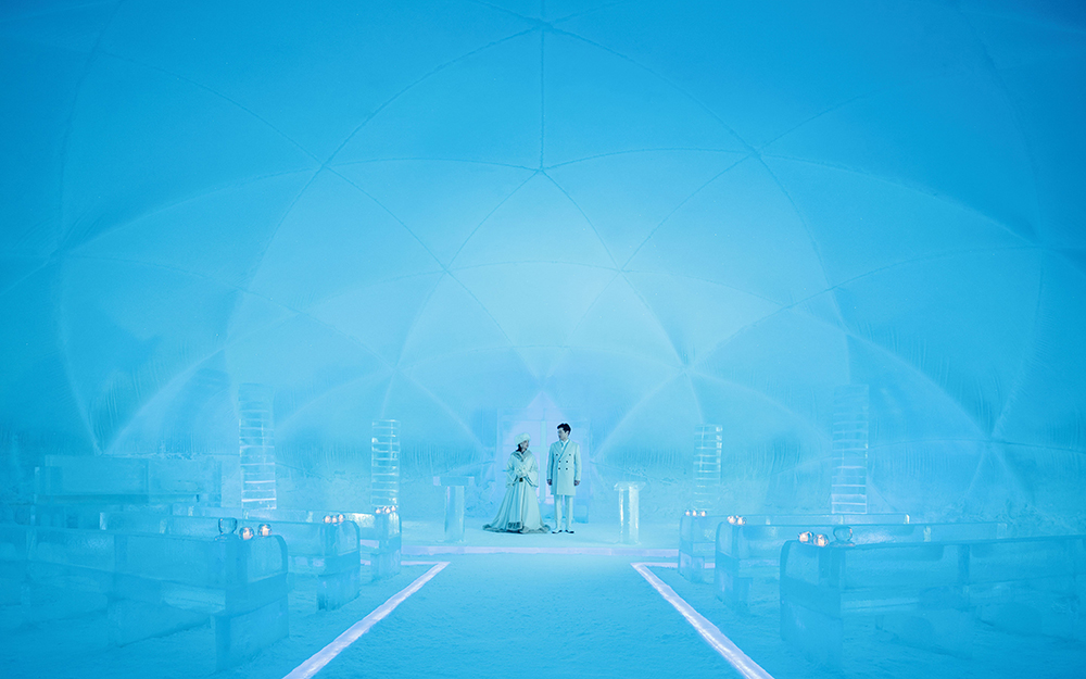2005年の誕生以来、660組のカップルが式を挙げたこの教会は、“ふたりの純粋な気持ちが、途切れなく続く”という想いを込め、継ぎ目のない一枚氷で造られています。