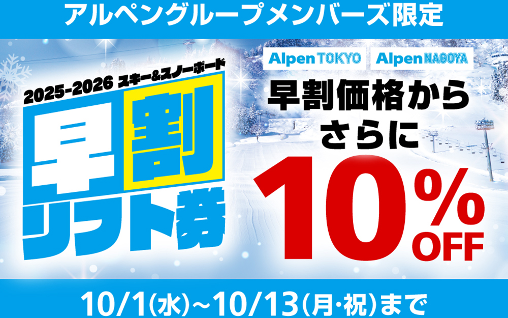 2025.10.02【Alpen TOKYO&NAGOYA】会員限定で早割リフト券がさらに10%OFF! 2025年10月13日まで