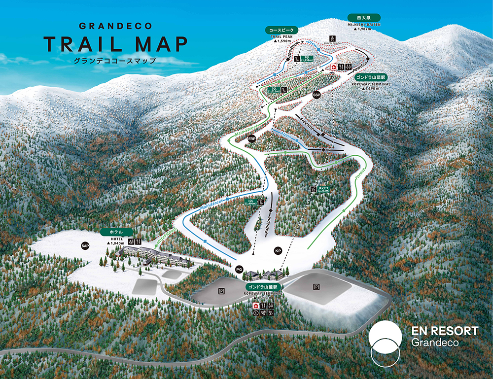 ファミリー層に人気は「Main Street」から「Forest」に抜ける約3,500mの超緩斜面。ゴンドラ1本で回すことができる点も要チェック! お泊まり派にはスキーイン&アウトが可能な「EN RESORT Grandeco Hotel」がおすすめです。