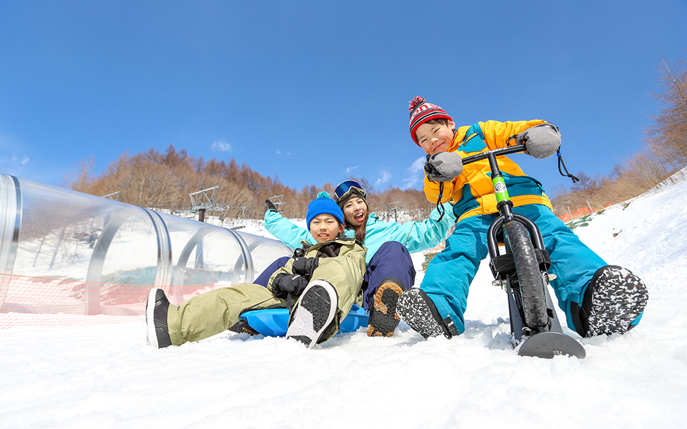 川場スキー場の麓にある「ファーストステップゲレンデ」はドーム型スノーエスカレーター完備。そり遊びとスキー&スノーボードの練習用エリアが分けられているので安心して遊べます。