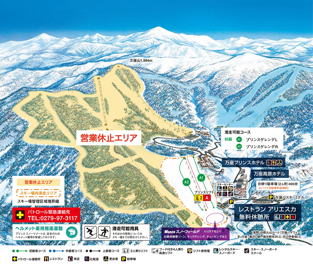 ゲレンデはボトムでも1,654mと標高が高く、上質な雪が豊富。ゲレンデサイドにはスキー場直営「万座プリンスホテル」があり、温泉&スキーの宿として人気です。