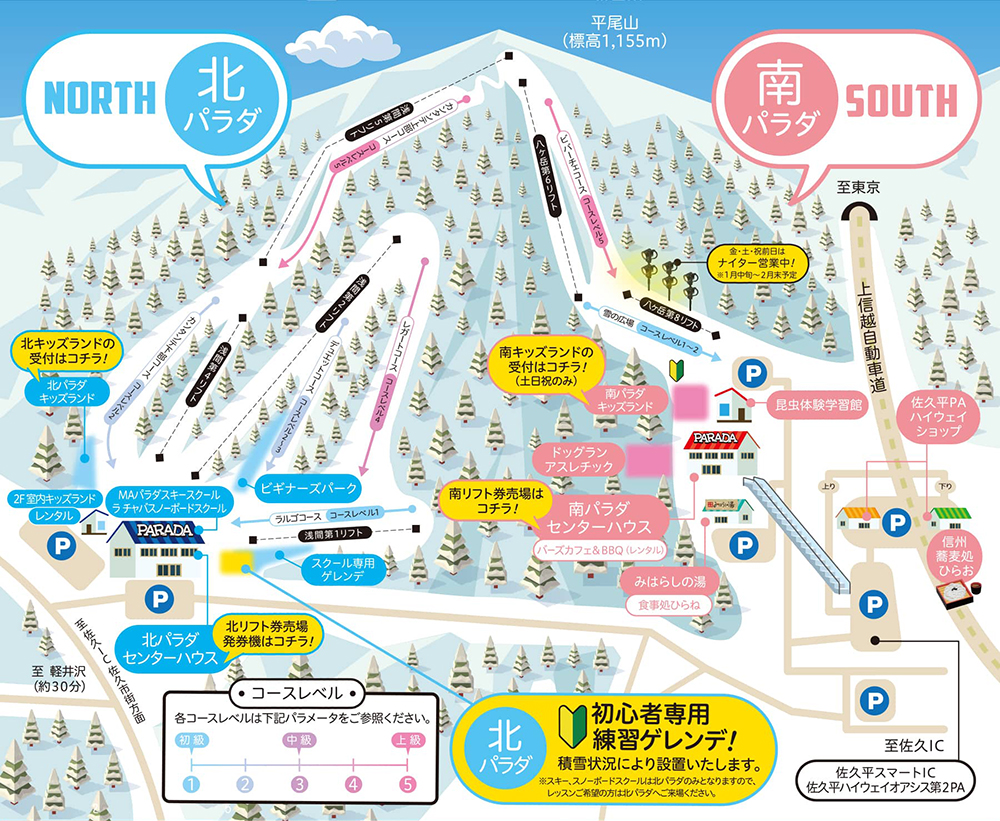 佐久スキーガーデン「パラダ」(長野 佐久市)は上信越道 佐久平PAからエスカレーターで「南パラダ」へダイレクトインできる高速道路直結のスキー場です。「北パラダ」へ行く場合も佐久平スマートICから約5分とアクセス抜群!