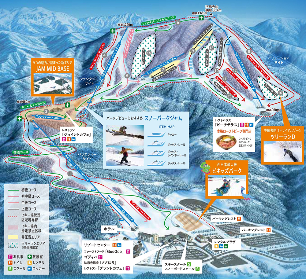 多彩な全16コースに、最長滑走距離5,800mを誇る「スキージャム勝山」(福井 勝山市)。西日本最大級のキッズ&ビギナーパーク「ビキッズパーク」はムービングベルトを完備。スキー・そり等のエリア分けも完璧で、ファミリー層に絶大なる人気を博しています。