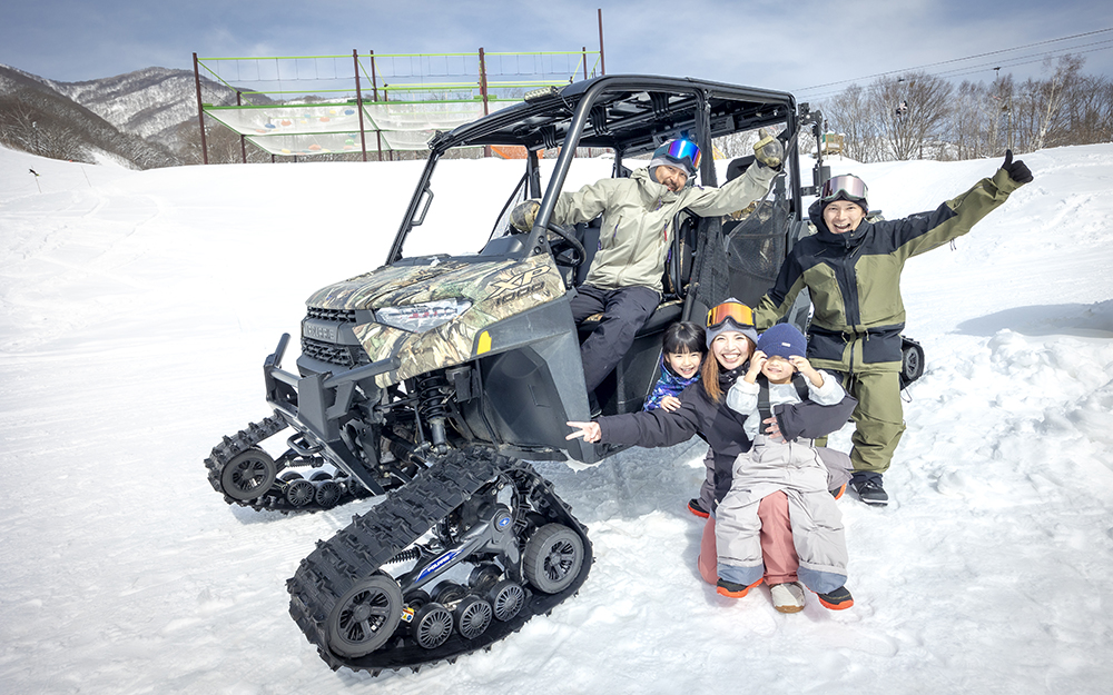 つがいけマウンテンリゾートのゴンドラ「イヴ」山頂駅近くにある「SNOWアクティビティWOW!」。話題のアミダスやバギークルージングなど、雪上アクティビティがとにかく多彩です。