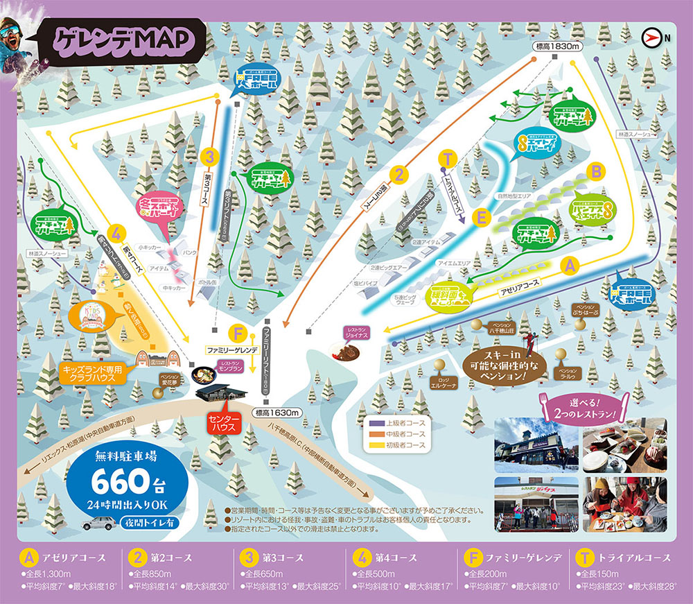 信州 北八ヶ岳「八千穂高原スキー場」(長野 佐久穂町)は山頂標高1,830mがもたらす極上のパウダースノーが自慢。ゲレンデはリフト4本とコンパクトながら、スノーパークやプチツリーランなど、バラエティに富んだコース設定となっています。